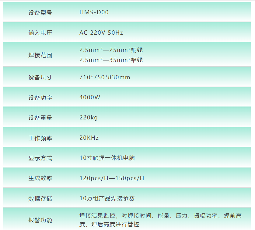 5、數(shù)據(jù)儲(chǔ)存:對(duì)焊接日期、數(shù)量、規(guī)格、時(shí)間、能量、功率、頻率等關(guān)鍵參數(shù)進(jìn)行儲(chǔ)存,儲(chǔ)存數(shù)量達(dá)10萬組。
