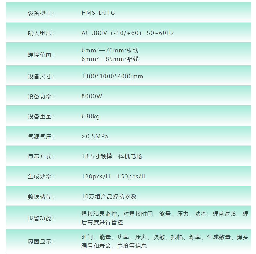 聯(lián)機功能:MES系統(tǒng)可識別、采集設(shè)備單次焊接輸出功率、焊接行程、焊接時間等數(shù)據(jù)(連接MES需要提前定制對接系統(tǒng));