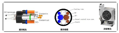 液冷充電槍利用內(nèi)部的水管及冷卻液,可以帶走電纜產(chǎn)生的熱量,以此實(shí)現(xiàn)更大的電流傳輸。液冷充電槍還需要配套冷卻單元,其由水箱、水泵、散熱器和風(fēng)扇組成,水泵驅(qū)動(dòng)冷凍液在槍線循環(huán)流動(dòng),將熱量帶至散熱器由風(fēng)扇吹走,實(shí)現(xiàn)了更大載流量。