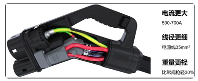 液冷充電槍內(nèi)部有電纜和水管,500A液冷充電槍的電纜通常是35mm2,它可以通過(guò)水管內(nèi)的冷卻液流動(dòng)來(lái)帶走熱量。由于電纜更細(xì),所以液冷充電槍要比常規(guī)的充電槍輕30%~40%。