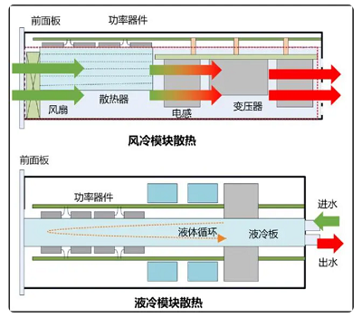 常規(guī)充電樁及半液冷充電樁的樁體都是風(fēng)冷散熱,空氣從一側(cè)進(jìn)入樁體,吹走電氣元件、整流模塊的熱量,從另一側(cè)樁體散出。但是空氣會(huì)夾雜著灰塵、鹽霧及水氣并吸附在內(nèi)部器件表面,導(dǎo)致系統(tǒng)絕緣變差、散熱效果變差,充電效率降級(jí)和設(shè)備壽命減少。對(duì)于常規(guī)充電樁或是半液冷充電樁來(lái)說(shuō),散熱和防護(hù)是兩個(gè)相互矛盾的概念,因此防護(hù)好則散熱較難設(shè)計(jì),散熱好則防護(hù)較難處理。